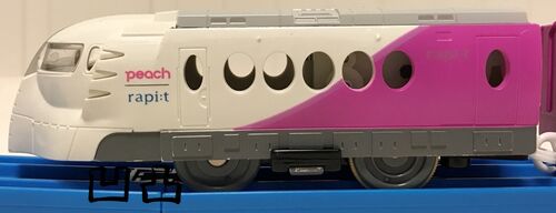 Peach×ラピート ハッピーライナー 発売:2015年2月 製造国:ベトナム 定価:税抜2200円 〈備考〉 「ぼくもだいすき!たのしい列車シリーズ」で限定販売されたプラレールです。 2014年9月から2015年8月まで運行されていたPeach aviationとのコラボラッピング…
